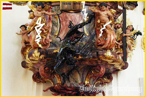 巴洛克式的教堂,當然少不了我喜歡的壁畫。不過,這拿著閃電的天使雕像,更令我好奇。