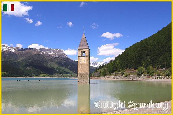 過了海關後約2公里,來到Lago di Resia湖,它的面積有6.6 km²,是阿爾卑斯山區海拔1000公尺以上最大的湖。