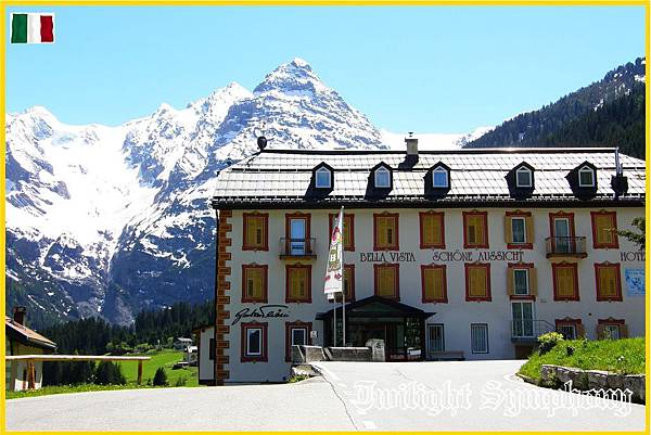 天氣真好!從Prato allo Stelvio小鎮進入到山頂Passo dello Stelvio,長約25公里,共有48個髮夾彎。這是山下位在第46彎的BELLA VISTA HOTEL。