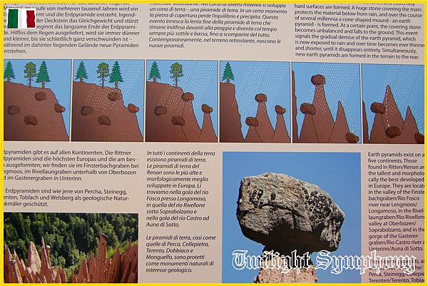 Le piramidi di terra的解說看板,簡單的說就是這裡的土質有些比較鬆軟,在經過了雨水的沖刷之後,較鬆軟的部份被沖刷掉了,而留下較硬的土質。原先在土壤當中的石頭,有些就被頂在土錐之上。不過這並不表示說現在看到的土錐就不會再被沖刷掉,而那些被頂起來的石頭終有一天還是會因底下的土錐支撐不了而掉下來。