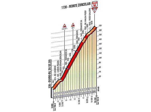 Ovaro到Monte Zoncolan雖然路程短一點,只有10.1公里,但卻爬升了1203公尺,平均坡度11.9%,最大坡度更來到22%,選手大約需要33至40分鐘左右的時間。