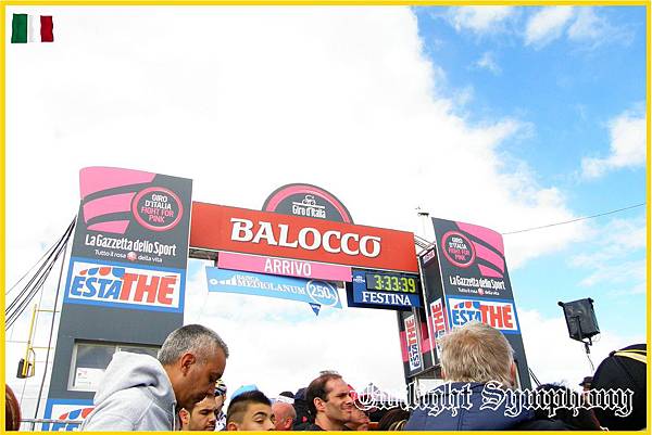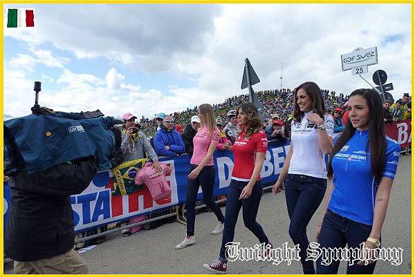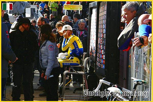 原本我們沒能站在第一排,不過好心的義大利爺爺說沒關係,等等選手上來的時候,可以讓我站到欄杆旁,讓我可以把太陽瘋的車衣亮出來。