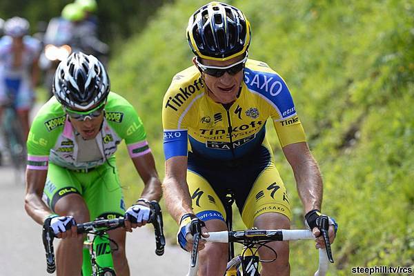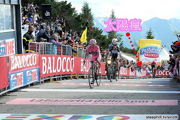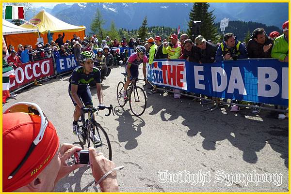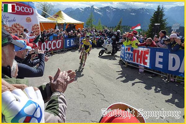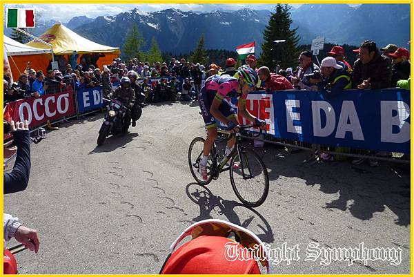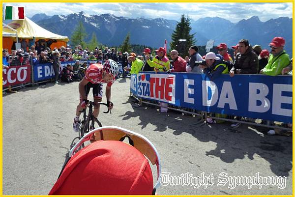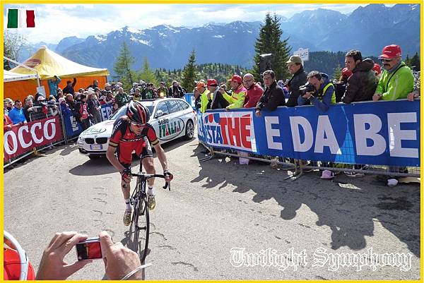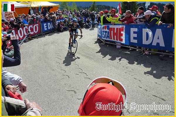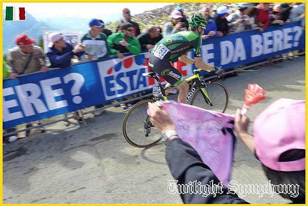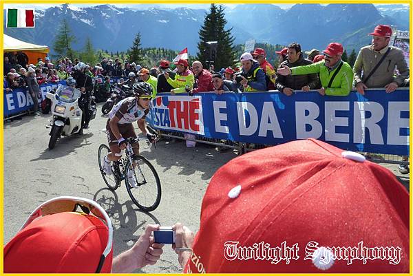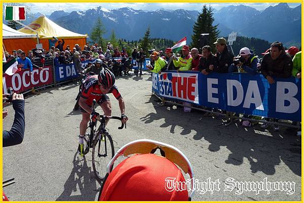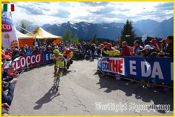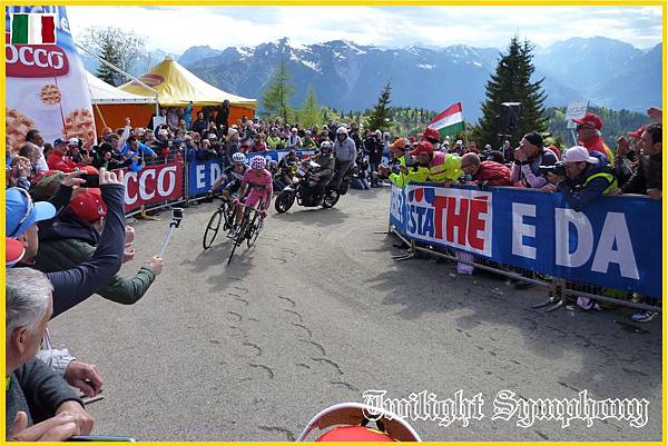 原來是此時車隊前方的兔子已經開始在爬Monte Zoncolan了。最前方的兩位車手是TINKOFF-SAXO車隊的Michael ROGERS,以及義大利車手Francesco Manuel BONGIORNO(BARDIANI CSF)。
