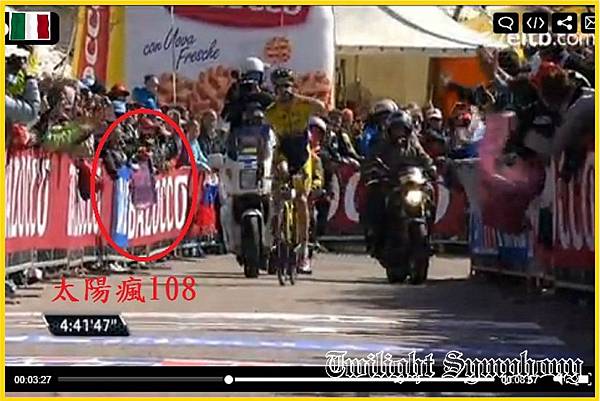 這是從轉播影片上擷錄下來的照片,對照這張圖片就可以看到我們隱身在人群中,揮舞的手中的車衣,只是導播怎麼都不cue me !?