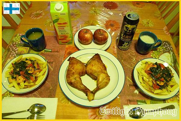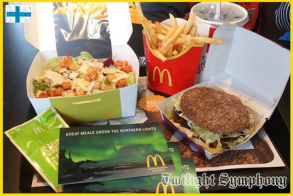 這裡有提供免費WiFi,我們買了雞肉凱薩沙拉、芬蘭漢堡、薯條及可槳,一共是14.4€,約台幣490(以1:34計算)。本來要點傳說中的馴鹿肉漢堡的,但漂亮的女店員說沒有。是現在不賣了嗎?但免費明信片還是有送啦!