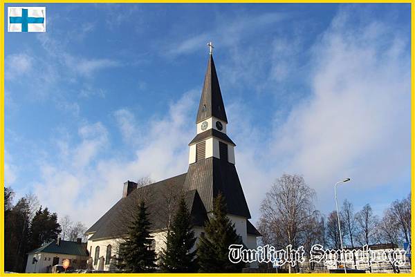 Rovaniemen kirkko教堂拍一下,教堂完工於1950年,取代在1944年10月16日,於拉普蘭戰役中被燒毀的舊教堂。後方有二戰紀念碑及墓園。
